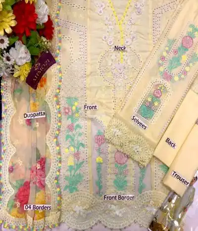 Detailed Neck Embroidery on Fabric with 3D Flower or Pearl Work